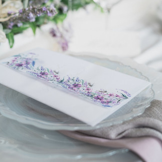 In the middle of the table we have the flowers in one long, and importantly, continuous row of lavender and 'Amazing grey' poppies to evoke the lavender in the fields that first inspired me. The physical construction of the centrepiece proved to be a little challenging, but nothing that our clever florist couldn’t solve!”